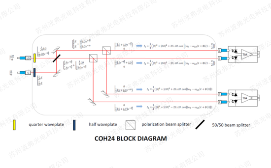90°光混頻器(超鏈接)在相幹光通信係統中的主要作用是(shì)將兩束頻率(lǜ)接近、相位差恒定的且偏振方向相同的信號光與本振光波(bō)進行相幹混頻(pín),再利用光電(diàn)平衡(héng)探測器和(hé)信號處理(lǐ)對中(zhōng)頻信號進行(háng)分析,可以(yǐ)看(kàn)出其原(yuán)理上也是一種調製解調器。常見的 90°光混頻器為(wéi)2(輸入)x4(輸出(chū))端口結構,如上圖,其(qí)由分立的四分之一波(bō)片、半(bàn)波片和偏振分光鏡等光(guāng)學(xué)元器件構成(chéng),四個(gè)輸出端分別相差為0°、180°、90°和(hé)270°。0°與180°輸出端經過(guò)平(píng)衡探測器後的支路稱為同相I支路,90°與270°輸出端經過(guò)平衡探測器後的支路稱為正交Q支路。