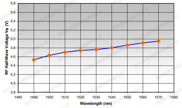 上圖給(gěi)出了半波電壓隨激光(guāng)光源波長的變(biàn)化。