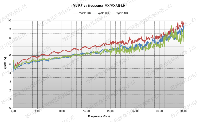這是因為盡管與材料無關,但是設(shè)計和生產方麵(miàn),任何射頻(pín)電子零(líng)部件,隨著頻率(lǜ)的(de)升高都會有射頻(pín)的(de)衰減,其功率從最高點下降到1/2的位置對應的頻率,我們稱為-3dB帶寬(請參考微信文章“iXblue電光調製(zhì)器常見參數(shù)定義”)。雖然材料本身的參數並不隨頻率升高而變化,但是波導的電極等射頻部分(fèn)不可(kě)避免的存在高頻衰減,因此調製器的射(shè)頻半波電壓Vp RF隨著頻(pín)率的升高而升高。