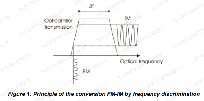 濾波器斜(xié)率引入的強度變化將頻率調製變為強度調製FM-IM,可由光探測器轉換成電信號。但前麵提到的熱不(bú)穩定性限(xiàn)製(zhì)了這種方(fāng)案的使用。然(rán)而,通(tōng)常可用帶寬為1nm的可調諧濾波器可用於此設置。