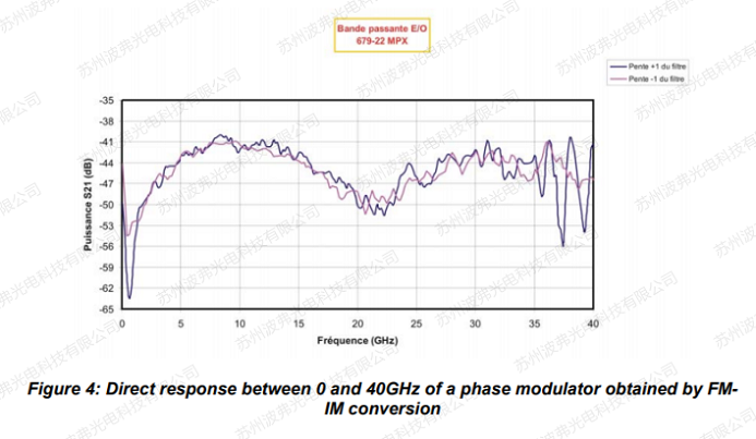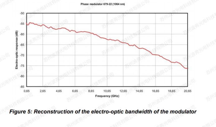 最終產生的強度調製的振(zhèn)幅取決於頻率f、濾(lǜ)波器的δf、先前校準過的驅(qū)動電壓以及要(yào)確定的調製器的(de)頻率響應。重要的一點是,必須(xū)工作在小(xiǎo)信號模式以適應信號Vo的振幅。調製器的電光響應S21必須用頻率f歸一化。頻率越高(gāo),精度越高(gāo)。在圖5所(suǒ)示的結(jié)果(guǒ)上,頻率響應高於65MHz。