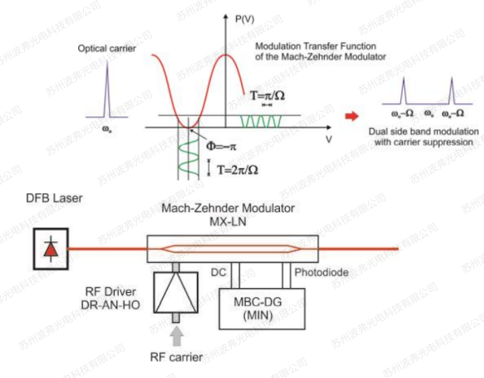 以(yǐ)上兩種方式,如果僅需要單邊帶,均需要FBG過濾掉不希望(wàng)的多(duō)階光譜。而FBG多(duō)為定點頻率和帶寬,這(zhè)無形中限製(zhì)了這種方案在(zài)掃頻方(fāng)麵的應用。而且,FBG一(yī)般較(jiào)好的投射(shè)/反射率<99%,僅僅相當於(yú)20dB的載波(bō)或邊帶抑製比(bǐ),在一些(xiē)特定應用中,希望得到(dào)更高的抑製比時這兩(liǎng)種方案就顯得無能為力了。為了解決上麵的問題(tí),一種新的載波抑製-單(dān)邊帶調製方案就應運(yùn)而生了。