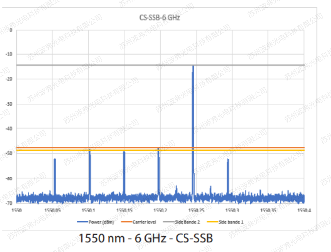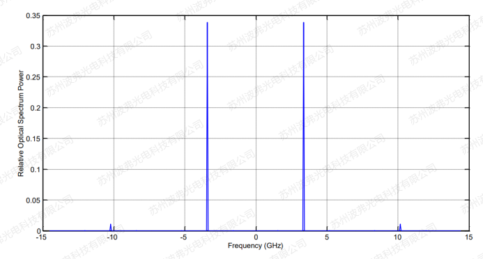 從上圖可以(yǐ)看出,當調製深度為2.4的時候,載(zǎi)波消失,請(qǐng)參考微信文章“電(diàn)光調(diào)製器半波電壓隨頻率的變化”,CS-SSB情況下,下圖為(wéi)相位(wèi)調製器輸出光譜(pǔ)的模擬計算結果,載波在”0”所處位置消(xiāo)失,±1階,±2階和±3階邊帶清晰可(kě)見,左右對稱分布。