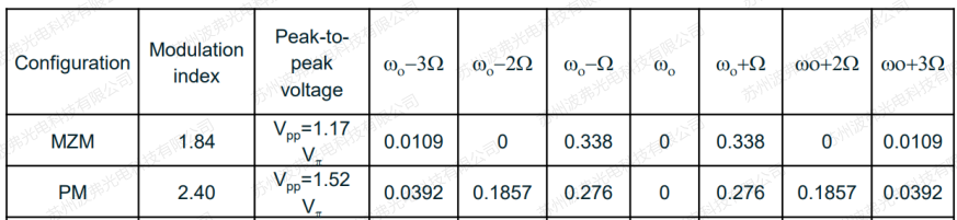 3. 強(qiáng)度調製器所(suǒ)產生的1階邊帶強度高於相位調製器(見下(xià)表),因為相位(wèi)調製器有部分強度(dù)分(fèn)布在其他階邊帶上