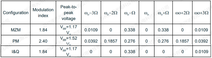 強度(MZM),相(xiàng)位(PM),IQ(I&Q)調製器在載波抑製情況下,調製深度(Modulation index),調製器驅動電壓(Peak-to-peak voltage),載波ω0, ±1階(ω0±Ω),±2階(ω0±2Ω)和±3階(ω0±3Ω)