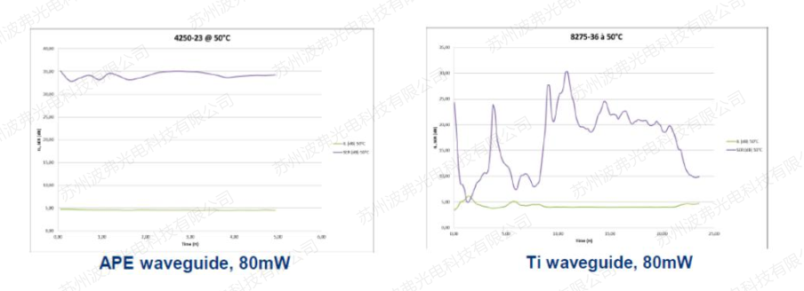 再一次聲明,即使(shǐ)在某些廠商的參數手冊上,鈦擴散工藝製造出的調製器在(zài)近紅外波段優於退火質子交換工藝,但是鈦擴散工藝的(de)光折變效應會在低激光(guāng)功率時(shí)更早的介入(rù),器件的性能將不再受控。所有iXblue近紅外波段的調(diào)製(zhì)器使(shǐ)用退火質子交換工藝,減小光折變的影響,提供更穩定的性能。