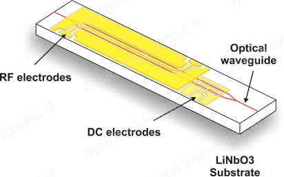 铌酸鋰的晶體光(guāng)學折射率(lǜ)被外部電場調製,外部電(diàn)場通過電壓施加在晶(jīng)體的電(diàn)極上,他們通常有兩個電極,調製電極(jí)(也稱RF電極)和DC直流電極(jí)(也稱偏壓電極)。