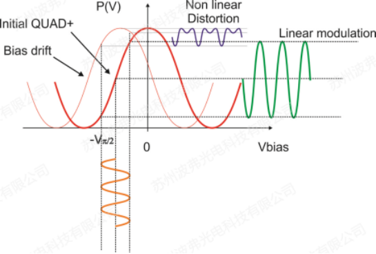 如上所述(shù),Mach-Zehder幹涉儀的兩條光路不(bú)是完全的一樣。另外,它的漂移還被溫度和熱量的變化,使用時間,光強效(xiào)果,靜電等影(yǐng)響,這將導致傳輸曲線(xiàn)在水平方向移動。當電調製(zhì)信(xìn)號施加在移動的工作點上,輸出的(de)光(guāng)調製信號將完(wán)全被改變。