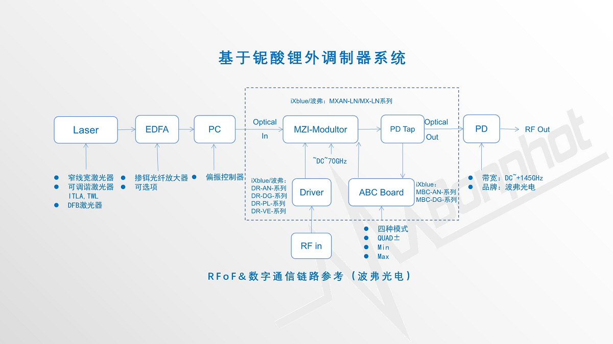 目前市麵上(shàng)RFoF係統,有直接調製激光器(Directly modulated lasers)、電吸收調製器(Electro-absorption modulator)、铌(ní)酸鋰外調製器(Lithium Niobate Mach-Zehnder Modulator)設計方式,相對(duì)於直接調製、電吸收調製器(qì)較容易(yì)收到帶(dài)寬(kuān)、消光比性能限製,铌(ní)酸(suān)鋰外調製器方式具(jù)有無可(kě)比(bǐ)擬的高(gāo)帶寬、低插損、高線性等優勢。