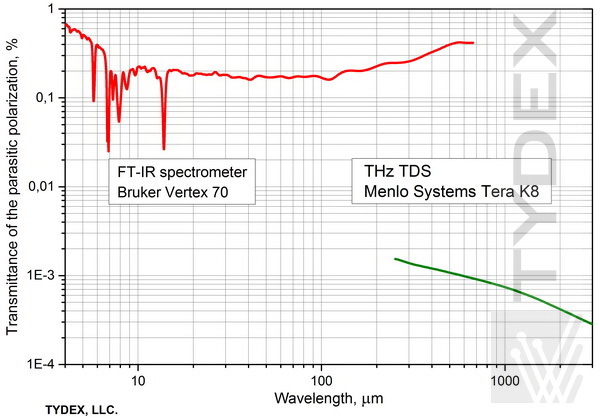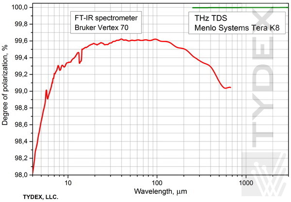 上麵的曲線清(qīng)楚地表(biǎo)明我們的偏振器在非(fēi)常寬的波長範圍內具有出(chū)色的質量。 請注意,實際(jì)測量結果可(kě)能與上麵給出的值不同,具(jù)體取決於光譜儀類型和測(cè)量模(mó)式。