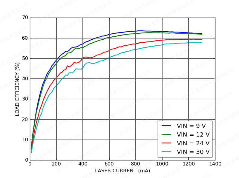 下圖顯(xiǎn)示了具(jù)有200 mV激光驅動器壓降的(de)CTL300E-1-1200控製器的整(zhěng)體負載效率(=激光電功率/輸入功(gōng)率)。