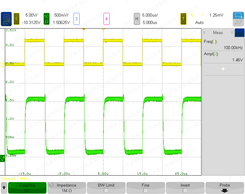 使用具有400 mV激光驅動器壓降的Thorlabs BL976-SAG300泵浦激光二極管在100 mA和600 mA之間切換的示例(lì)(黃色:BSEL信號3.3 V 100 kHz,綠色:激光二(èr)極管輸(shū)出功率):