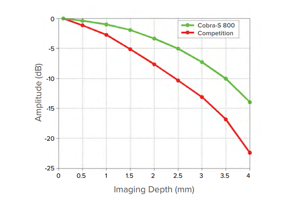 與我們(men)的旗艦產品(pǐn) Cobra-S 800 一樣,Cobra OEM OCT 光譜儀提供卓越的滾(gǔn)降性能,從信號與成像(xiàng)深度的比較中(zhōng)可以(yǐ)看出。 由於滾降更少,可以比典型的 800 nm 成(chéng)像更清晰地成像更深的結構。
