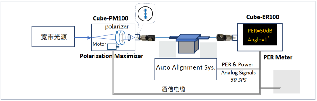 在(zài)測量保偏器件的偏振消光比(PER)時 ,較低的光源線偏(piān)振度 ,以(yǐ)及線偏振光與保(bǎo)偏光纖(xiān)光軸之間的對軸角度偏差是PER測量誤差(chà)的(de)主要來源。為了最大限度的消除這兩種測(cè)量(liàng)誤差源, 本(běn)公司自豪地推出了業(yè)界首個自動化偏振消光比測量係統。