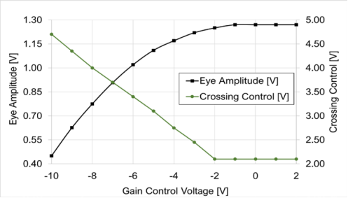 圖13至圖18中的數據是使用MICRAM DAC4信號源和帶有50GHz(SE-50)遠程采樣模塊的LeCroy SDA 100G采樣示波器獲得(dé)的。所有(yǒu)測量均在270mV輸入(rù)眼振幅和51%輸入眼交(jiāo)叉點進行。增益控製和交叉(chā)控製(zhì)功能取決於輸入幅度。交互調整兩個控件以控製輸出振幅,同時保持50%的交叉點,如圖15至圖18所示。